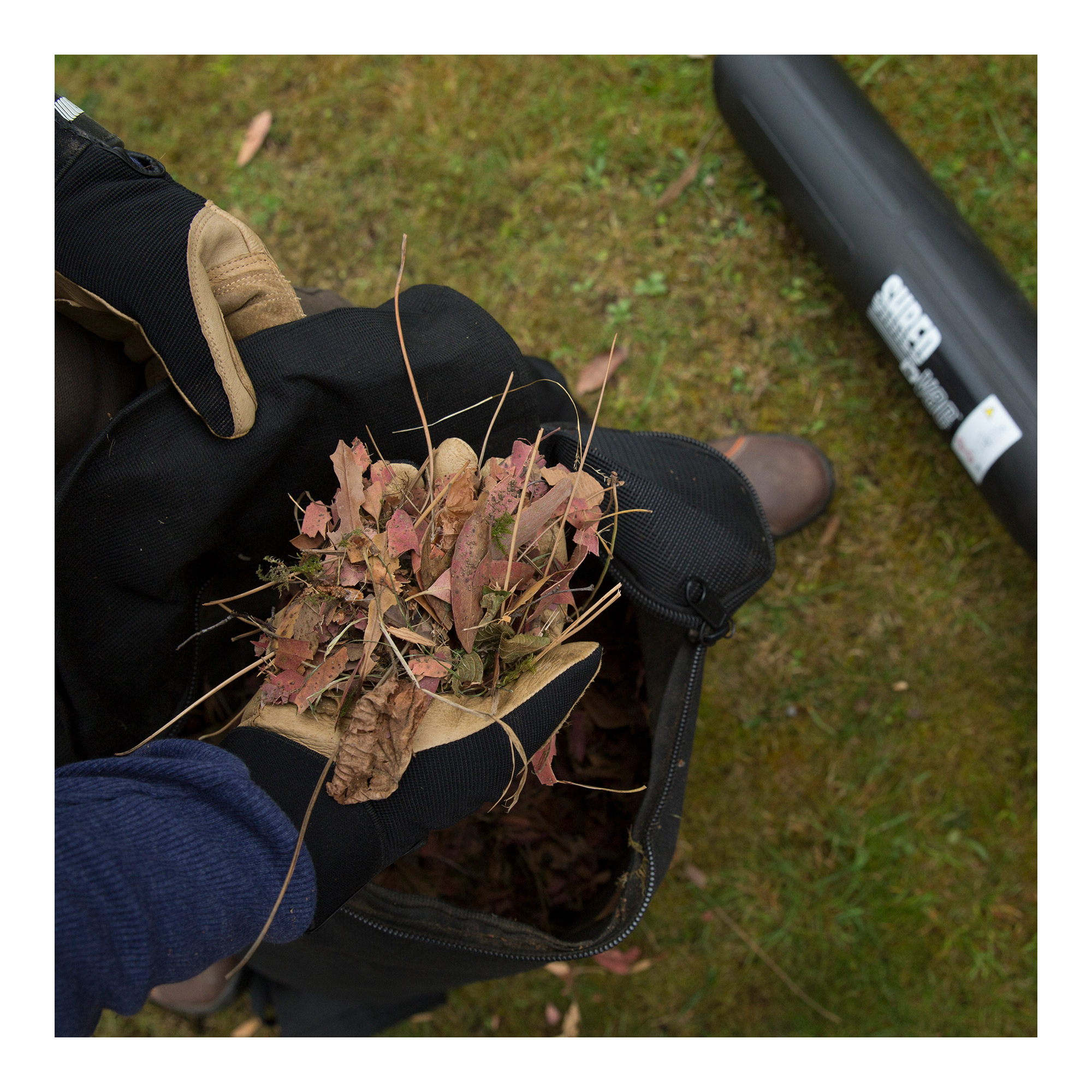 Der Fangsack mit seinen 68 Litern Aufnahmevolumen ist über die große Öffnung mit Reißverschluss leicht und schnell zu entleeren. Damit der Bediener des Laubzerkleinerers nicht schmutzig und nass wird, ist auch ein Spezialfangsack erhältlich, der während der Arbeit dicht bleibt und keine Feuchtigkeit zum Anwender dringen lässt.