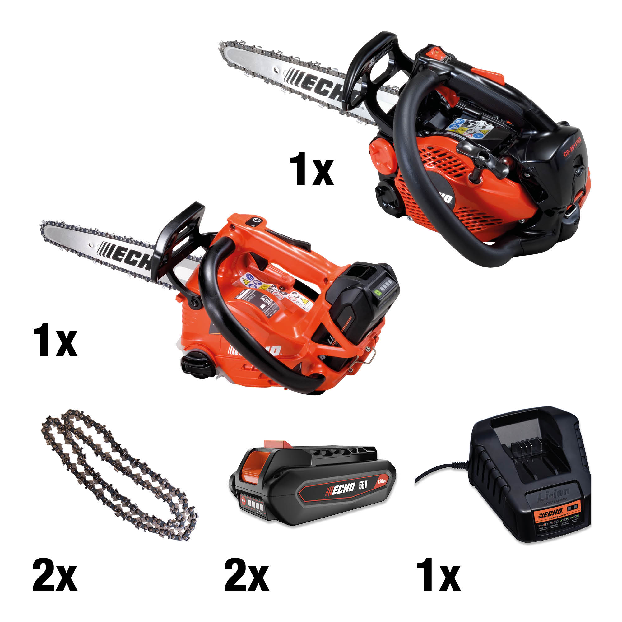 Entdecke das exklusive ECHO Baumpflege Set - die einzigartige Kombination aus der legendären CS-2511TESC Top-Handle Benzin-Baumpflegesäge und der innovativen DCS-2500TC 56V Akku-Carvingsäge. Dieses durchdachte Profi-Bundle vereint bewährte japanische Ingenieurskunst mit modernster Akku-Innovation und bietet dir die ultimative Flexibilität für alle professionellen Baumpflege- und Carving-Aufgaben.